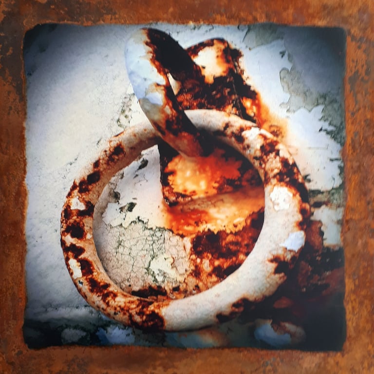 Beeld en roestend kader gaan na verloop van tijd een relatie met elkaar aan, waarbij grenzen vervagen en door elkaar lopen. Het werk zelf lijkt te vergaan, net als het onderwerp.