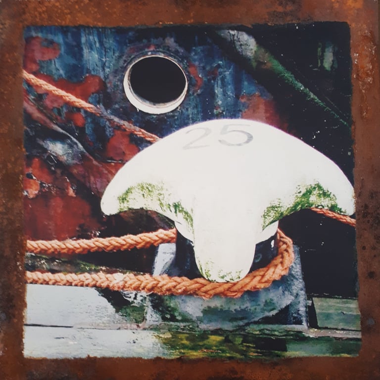 Op roestend staal toont zij close-up fotobeelden van bloem en blad dat vergaat en detailbeelden van oude schepen en industrie aan de kaden. Soms in scène gezet of bijna grafisch, dan weer natuurlijk, door de omgeving, uitgelicht. Door heel dichtbij te komen ontstaan nieuwe beelden: taferelen van roest, bladder en vergane glorie.