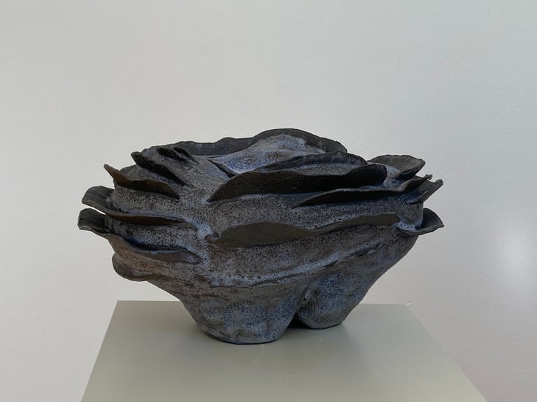 De klei die Froukje gebruikt is zwart bakkend, de eind stook is op 1200 graden. Zij gebruikt ruw uitsmeltende glazuren, ze geven het werk een verweerd uiterlijk. Het lijkt of de tand des tijds er over heen is gegaan.