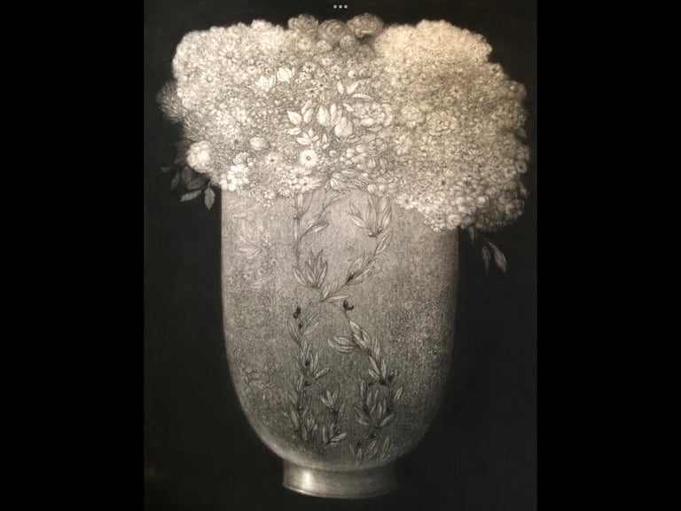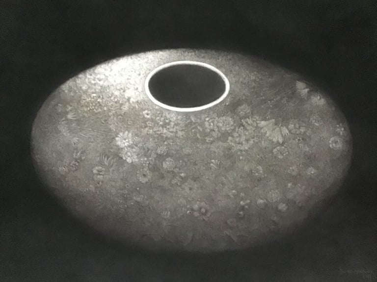 Door middel van tekenen wordt een spoor in de geest gerepresenteerd in de werkelijkheid. Een dialoog tussen abstractie en figuratie. Zinnebeeldige elementen, zoals een kom op een palimpsest ondergrond, of verstild zwevende op een fluweelzwarte achtergrond waar het gedeeltelijk verdwijnt.