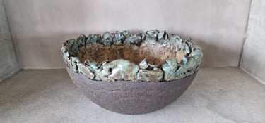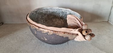 Naast de hierboven beschreven objecten toon ik een aantal kommen. Krachtige, eenvoudige vormen met elk een eigen speels detail. Ik houd van de zeggingskracht van de halve bol. Er valt niet aan te tornen, daarom is het toevoegen van iets eigenaardigs bijna een ondeugend moment! Ik geniet van dit proces en hoop de kijker ermee te raken.