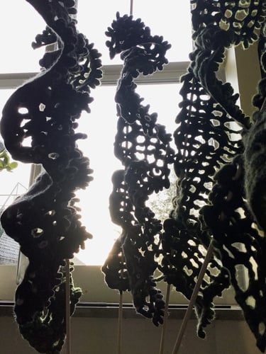 Het viltwerk van Magda is heel divers: stevig of fragiel en transparant, twee- of driedimensionaal, hangend of staand. De vorm is afhankelijk van de verwerkte grondstoffen; de soort schapenwol en de eventueel toegevoegde materialen. De kleur is naturel of geverfd.
