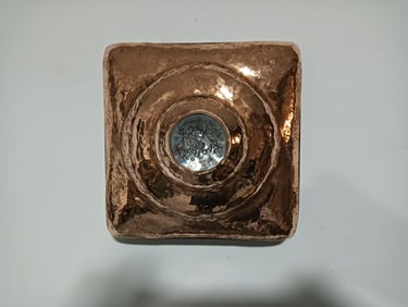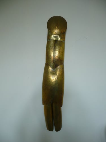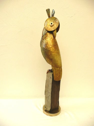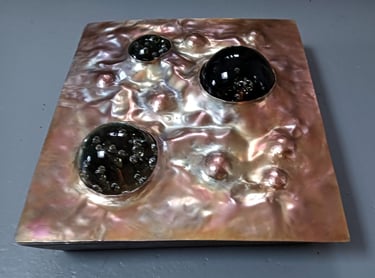Het materiaal dat ik gebruik is hoofdzakelijk koper en haar legeringen, daarnaast, kunststof, steen, hout en glas. Platte plaat is mijn uitgangspunt. Met behulp van hamers, drijfblokken en staken worden de vormen gedreven en gecomponeerd tot een geheel, waarbij de segmenten duidelijk zichtbaar blijven. Keistenen, glas of hout, worden vaak gebruikt als onderdeel van het geheel. De geheimen van het metaal worden ontfutseld, de glans en rekbaarheid krijgt betekenis.