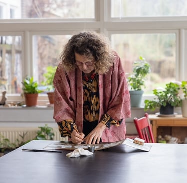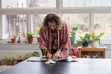 Tijdens de Open Atelier Route demonstreert Jolande hoe zij planten gebruikt bij het maken van botanisch kunstpapier.